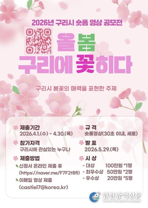 [인천광역신문] 최예준 기자 | 구리시는 올해 새롭게 시작하는 봄꽃 축제 ‘장자호수 벚꽃마실 축제’를 효과적으로 홍보하고 시민과의 소통을 강화하기 위해 ‘2026 구리시 숏폼 영상 공모전 '올봄, 구리에 꽃히다'’ 접수를 4월 30일까지 진행한다고 밝혔다.
