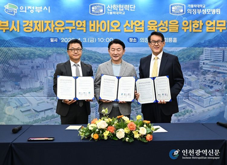 [인천광역신문] 최예준 기자 | 의정부시는 4월 3일 시청 회룡홀에서 가톨릭대학교 의정부성모병원, 가톨릭대학교 산학협력단과 함께 ‘의정부시 경제자유구역 바이오 산업 육성을 위한 업무협약’을 체결했다.