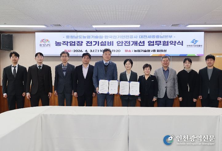 [인천광역신문] 최예준 기자 | 충남도 농업기술원은 3일 기술원 회의실에서 한국전기안전공사 대전세종충남본부와 ‘농업현장 전기설비 안전진단 및 기술지원’을 위한 업무협약(MOU)을 체결했다.