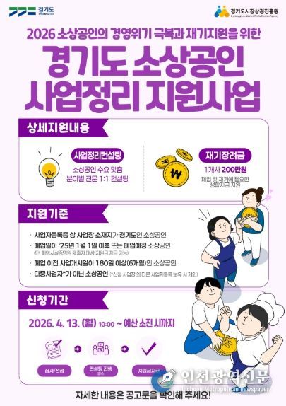 [인천광역신문] 최예준 기자 | 경기도시장상권진흥원은 도내 경영 위기로 폐업했거나 폐업을 앞둔 소상공인들의 안정적인 재기를 돕기 위해 ‘2026년 경기도 소상공인 사업정리 지원사업’을 추진한다고 밝혔다.