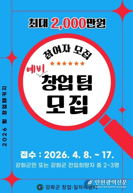 [인천광역신문] 최예준 기자 | 강화군 창업·일자리센터가 '2026년도 팀 창업패키지 지원사업' 참여자를 모집한다.