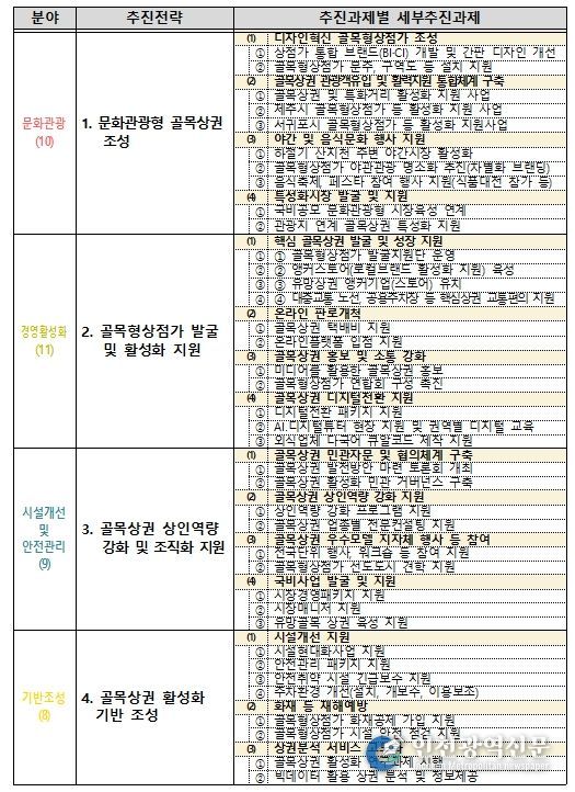 4대 전략과 38개 세부과제를 축으로, 3년간 총 212억 원 규모의 예산을 투입할 계획이다. 4대 전략은 ▲문화관광형 골목상권 조성 ▲골목형상점가 발굴 및 활성화 지원 ▲상인 역량 강화 및 조직화 지원 ▲골목상권 활성화 기반 조성으로 구성된다.
