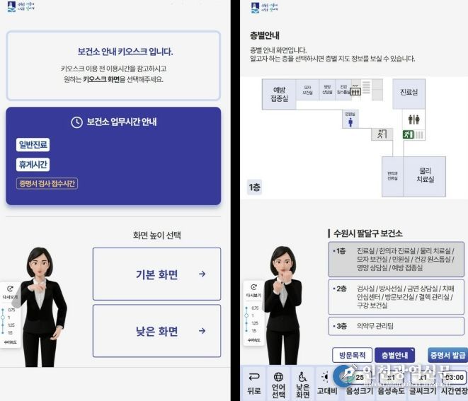 ▲수어 아바타를 통한 수어 번역 ▲화면 높낮이 조절 ▲시각장애인을 위한 고대비 화면 ▲영어·중국어 다국어 안내 ▲방문 목적·층별 안내 기능 등을 갖춰 보건소를 찾는 시민들이 더 쉽고 편리하게 서비스를 이용할 수 있도록 돕는다.