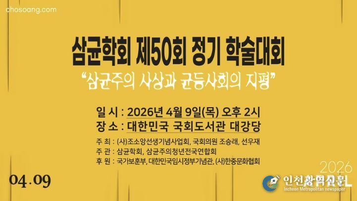 [인천광역신문] 최예준 기자 | 2026년 병오년(丙午年)을 맞아 '삼균학회 제50회 정기학술대회'가 국회도서관 대강당에서 개최된다. 이번 학술대회는 (사)조소앙선생기념사업회, 조승래 국회의원실, (사)선우재가 공동 주최하고, 삼균학회와 삼균주의청년연합회가 주관하며, 국가보훈부, 국립대한민국임시정부기념관, (사)한중문화협회가 후원한다.