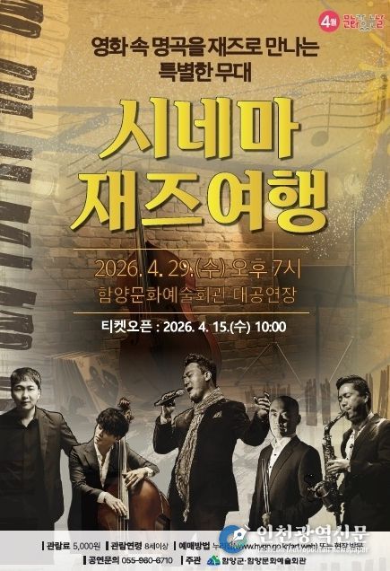 [인천광역신문] 최예준 기자 | 함양문화예술회관은 4월 문화가 있는 날을 맞아 영화 속 명곡을 재즈로 재해석한 공연 ‘시네마 재즈여행’을 오는 4월 29일 오후 7시 문화예술회관 대공연장에서 개최한다고 밝혔다.