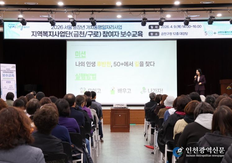 [인천광역신문] 최예준 기자 | 금천구는 금천50플러스센터에서 경험과 역량을 갖춘 중장년 세대들에게 지속적인 사회참여를 지원하기 위해 ‘2026년 서울 중장년 가치동행일자리사업’을 운영한다고 밝혔다.