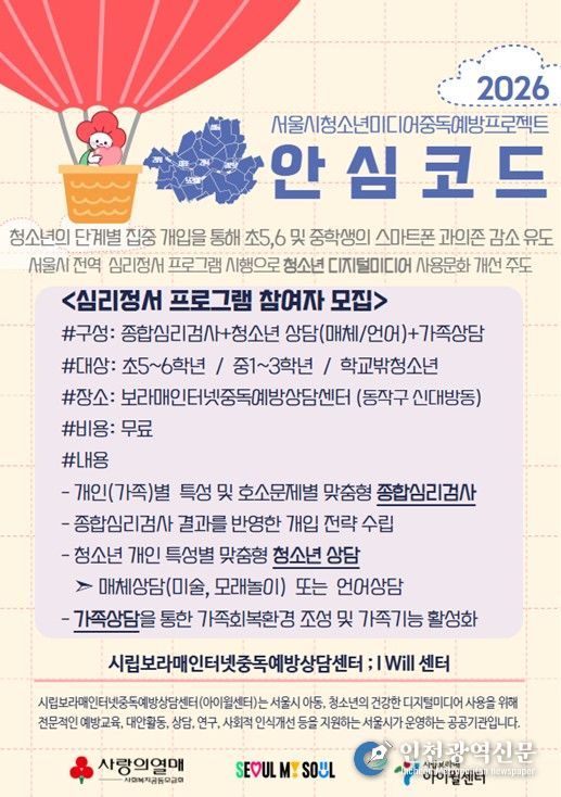 안심코드 프로그램은 올해 서울시 거주 초등학생 5~6학년 및 중학생 1~3학년, 학교 밖 청소년을 대상으로 무료 진행 중이며, 자세한 문의 및 신청은 시립보라매인터넷중독예방상담센터에서 할 수 있다.