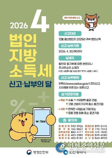 [인천광역신문] 최예준 기자 | 인천시 중구는 4월 한 달간 ‘법인지방소득세 신고·납부의 달’을 운영한다고 10일 밝혔다. 이에 따라 해당 법인은 오는 30일까지 법인지방소득세를 신고·납부해야 한다.