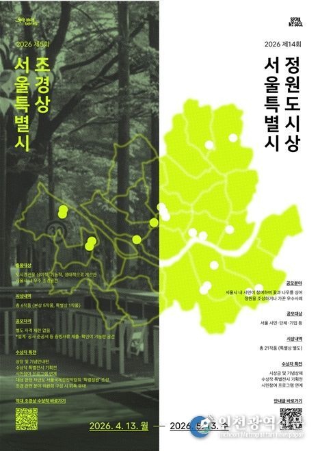 [인천광역신문] 최예준 기자 | 서울시는 도시경관 개선에 기여한 우수 조경공간과 시민참여 정원 사례를 발굴·확산하기 위해 '2026 서울특별시 조경상·정원도시상' 공모를 4월 13일부터 5월 13일까지 진행한다고 밝혔다.