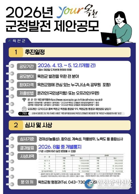 [인천광역신문] 최예준 기자 | 옥천군은 창의적인 정책 제안 발굴과 소통하는 열린 행정 실현을 위해 금일부터 내달 13일까지 '2026년 군정발전 제안 공모'를 실시한다.