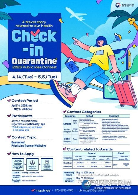 [인천광역신문] 최예준 기자 | 질병관리청은 건강한 해외여행 문화를 확산하고 여행자 건강 중심 검역에 대한 국민 인식을 높이기 위해 4월 14일부터 5월 5일까지 '체크인, 검역 : 우리가 만드는 여행건강 이야기, 국민 생각 공모전'을 개최한다.