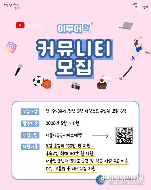 [인천광역신문] 최예준 기자 | 영등포구 서울청년센터가 지역 청년들의 주체적인 활동과 상호 교류를 활성화하기 위해, 청년 커뮤니티 사업인 ‘이루어영’을 운영하고, 참여팀을 모집한다고 밝혔다.