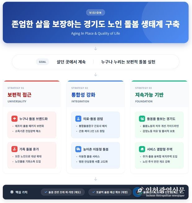 [인천광역신문] 최예준 기자 | 경기연구원이 빠르게 늘어나는 노인 인구에 대응해 ‘돌봄 생태계’ 구축을 핵심 해법으로 제시했다. 단순히 시설을 늘리는 방식이 아니라, 노인이 살던 집과 지역에서 계속 살아갈 수 있도록 다양한 돌봄 주체가 연결되는 새로운 시스템이다.