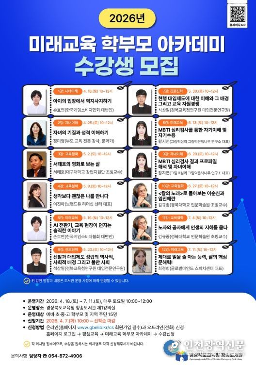 [인천광역신문] 최예준 기자 | 경상북도교육청 청송도서관은 4월 18일부터 7월 11일까지'2026년 미래교육 학부모 아카데미'를 운영한다.