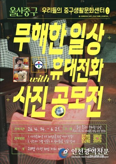 [인천광역신문] 최예준 기자 | 울산 중구에서 운영하는 중구생활문화센터가 4월 14일부터 6월 21일까지 ‘2026 우리 동네 무해한 일상’ 휴대전화 사진 공모전을 개최한다.