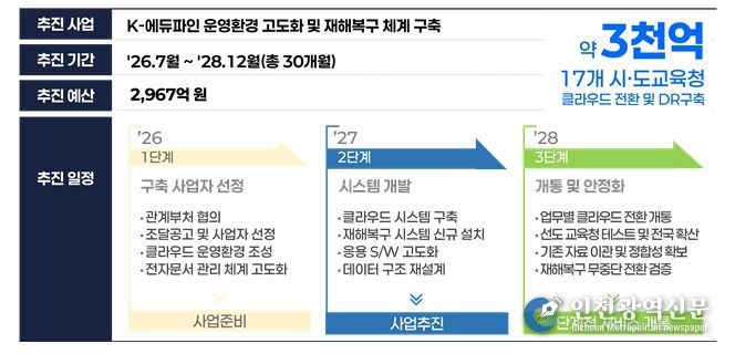 [인천광역신문] 최예준 기자 | 교육부는 전국 17개 시도교육청과 학교에서 사용하는 케이(K)-에듀파인의 재해복구 체계를 구축하고 운영환경을 고도화하는 사업을 본격 추진한다고 밝혔다.