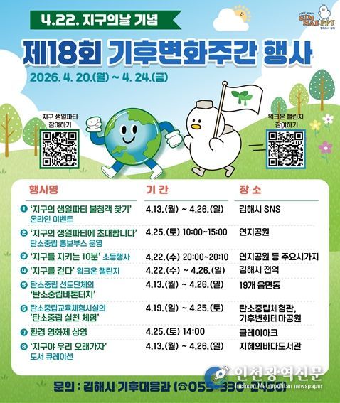 [인천광역신문] 최예준 기자 | 김해시는 제56주년 지구의 날(4.22)을 맞아 오는 20일부터 26일까지 ‘탄소중립 실천으로 세상을 잇다’라는 슬로건 아래 제18회 기후변화주간을 운영한다고 15일 밝혔다.