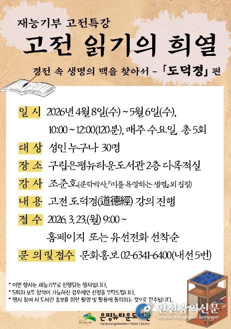 구립은평뉴타운도서관 관계자는 “이번 강좌를 통해 지역 주민들이 고전을 더 친숙하게 접하고, 삶을 돌아보는 의미 있는 시간을 보내길 바란다”고 말했다.