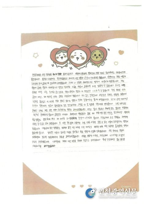 [인천광역신문] 최예준 기자 | 충주시 연수동에 전달된 한 통의 편지가 지역사회에 잔잔한 감동을 주고 있다.
