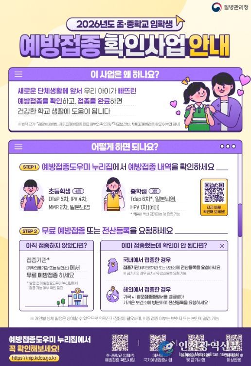 [인천광역신문] 최예준 기자 | 익산시는 학생들의 감염병 예방과 건강한 학교생활을 위해 '2026년도 초·중학교 입학생 예방접종 확인사업'을 오는 5월 29일까지 추진한다고 15일 밝혔다.