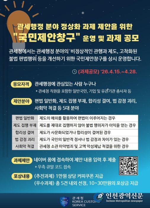이명구 청장은 “국민과 기업, 현장 공무원이 함께 참여하여 관세행정에 숨겨진 문제를 발굴하고 실질적으로 개선하는 것이 이번 프로젝트의 핵심”이라며, “관세행정 전반의 비정상을 바로잡아 공정한 경제질서 확립과 국민 신뢰 제고에 기여하겠다”고 밝혔다.