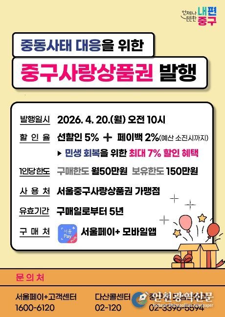 [인천광역신문] 최예준 기자 | 서울 중구가 중동전쟁으로 인한 경기 불안과 소비 위축에 대응하기 위해 20억 원 규모의 '서울중구사랑상품권'을 오는 20일 발행한다.