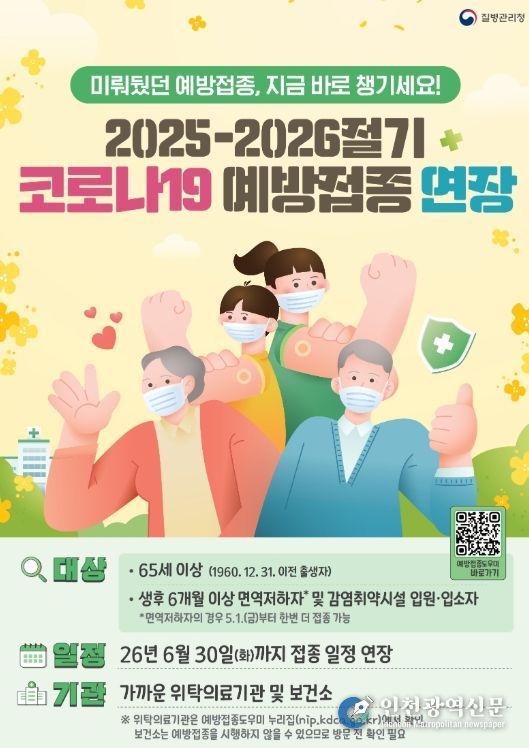 [인천광역신문] 최예준 기자 | 인천 미추홀구는 여름철 코로나19 재유행을 대비해 기존 4월 30일 종료 예정이었던 ‘2025~2026 절기 코로나19 예방접종’을 오는 6월 30일까지 연장한다.