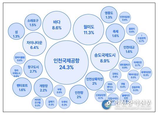 특히 인천 연상이미지는 ‘인천국제공항’(24.3%), ‘월미도’(11.3%), ‘송도국제도시’(8.9%), ‘바다’(8.6%) 등으로, 국제도시·공항도시, 해양·섬 관광도시 이미지를 확보했다는 점에서 의미 있는 성과로 평가된다.