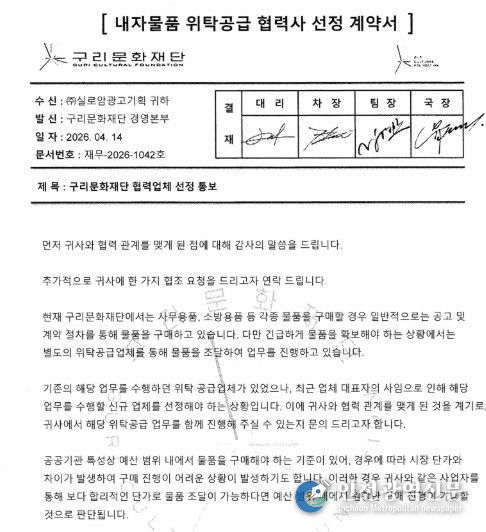 재단은 ‘내자물품 위탁공급 협력사 선정 계약서’ 등 실제 공문과 유사한 형식의 문서를 활용해 협력업체 선정을 통보하고, 물품 대리구매 등을 유도하는 사례가 확인됐다고 밝혔다.