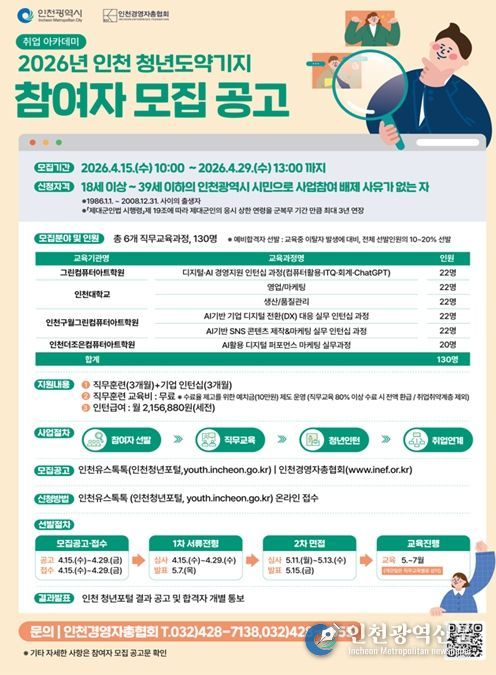 [인천광역신문] 최예준 기자 | 인천광역시는 청년의 취업역량을 강화하고 지역기업이 필요로 하는 실무형 인재를 양성하기 위해 ‘2026 인천 청년도약기지’ 사업 참여자 130명을 4월 15일부터 4월 29일까지 모집한다고 밝혔다.