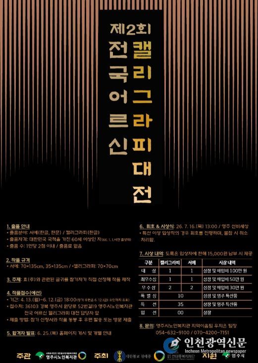 [인천광역신문] 최예준 기자 | 천태종복지재단 산하 영주시노인복지관은 어르신들의 문화예술 참여 기회를 확대하고 창작 활동을 지원하기 위해 '제2회 전국 어르신 캘리그라피 대전'을 개최한다.