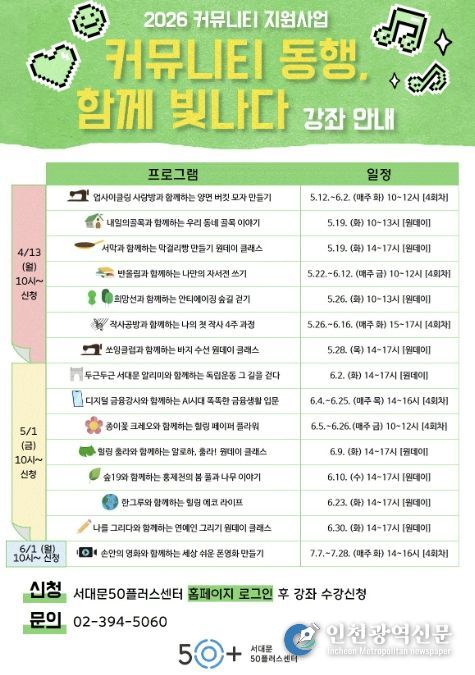 [인천광역신문] 최예준 기자 | 서대문구가 운영하는 서대문50플러스센터가 중장년의 자기 계발과 사회참여를 지원하는 교육 프로그램 ‘커뮤니티 동행, 함께 빛나다’를 센터 내 강의실과 야외 현장에서 5∼7월 운영한다.