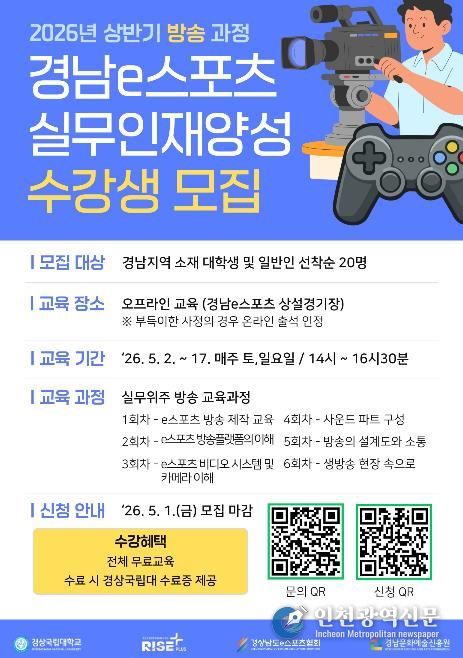 [인천광역신문] 최예준 기자 | 경상국립대학교 라이즈(RISE) 사업단은 지역 내 e스포츠 산업 전문가를 육성하기 위해 경남e스포츠협회 및 경남문화예술진흥원과 협력하여 ‘2026년 상반기 경남 e스포츠 실무인재 양성 과정’ 수강생을 모집한다.