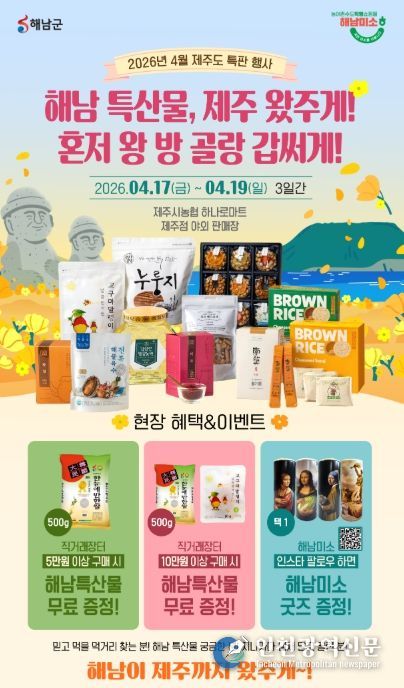 [인천광역신문] 최예준 기자 | 해남군은 바다 건너 제주 소비자를 찾아 오는 17일부터 19일, 3일간 제주시농협 하나로마트 제주점 야외특설매장에서 농수특산물 직거래장터를 운영한다. 이번 행사에서는 해남고구마를 비롯해 잡곡류, 차류, 가공식품 등 100여종의 다양한 농수특산물을 합리적인 가격으로 선보일 예정이다.