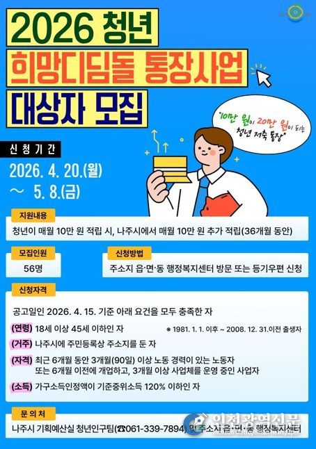 나주시는 2026년 청년 희망디딤돌 통장사업 신규 참여자 56명을 오는 5월 8일까지 모집한다고 17일 밝혔다.
