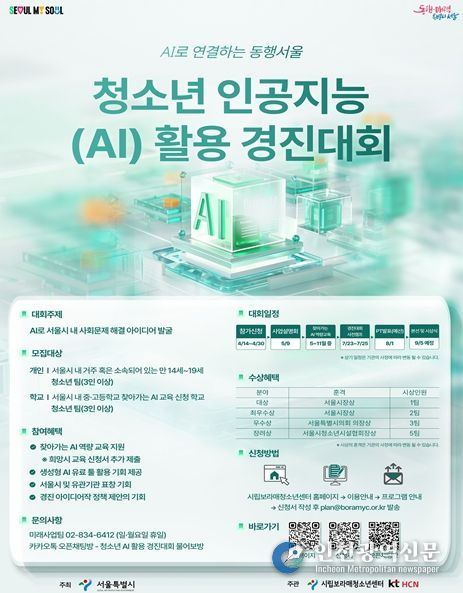 [인천광역신문] 최예준 기자 | 서울시는 청소년이 인공지능(AI)을 활용해 지역사회 문제해결 아이디어를 제안하고 이를 공공정책으로 연결하는 '2026 청소년 인공지능(AI) 활용 경진대회'를 개최하고 4월 30일까지 참가자를 모집한다.
