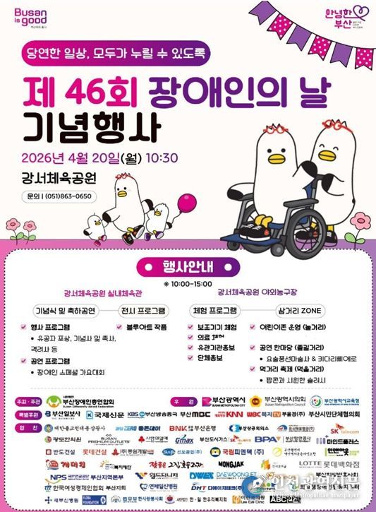 [인천광역신문] 최예준 기자 | 부산시는 오늘(20일) 오전 10시 30분, 강서체육공원 실내체육관에서 장애인에 대한 이해를 높이고 장애인과 비장애인이 함께 공감하는 장을 마련하기 위해 '제46회 장애인의 날 기념행사'를 개최한다고 밝혔다.