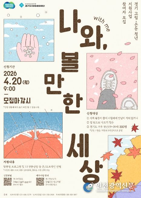 [인천광역신문] 최예준 기자 | 경기도가 사회적 관계가 단절된 고립·은둔 청년의 일상 회복을 돕기 위해 20일부터 ‘경기 고립·은둔 청년 지원사업: 나와(with me), 볼만한 세상’ 참여자 300명을 모집한다.