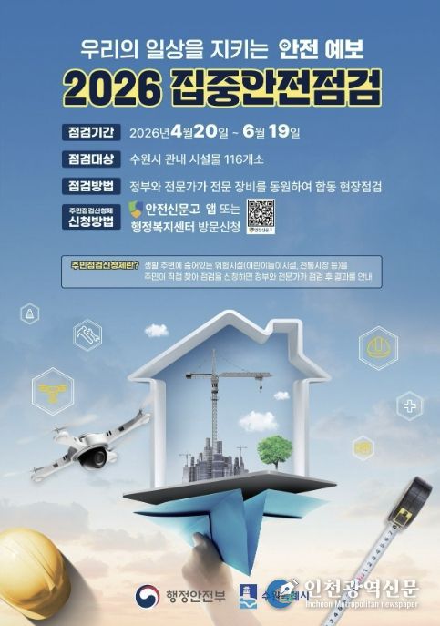 [인천광역신문] 최예준 기자 | 수원특례시가 안전사고를 예방하고, 시민의 안전 의식을 고취하기 위해 20일부터 6월 19일까지 ‘2026년 집중안전점검’을 한다.