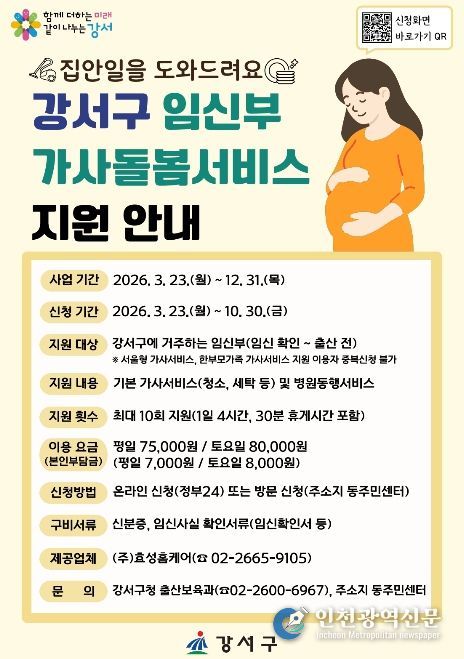 [인천광역신문] 최예준 기자 | 서울 강서구는 임신부의 가사 노동 부담을 덜고 건강한 출산을 돕기 위해 ‘임신부 가사돌봄서비스’를 확대 시행한다.