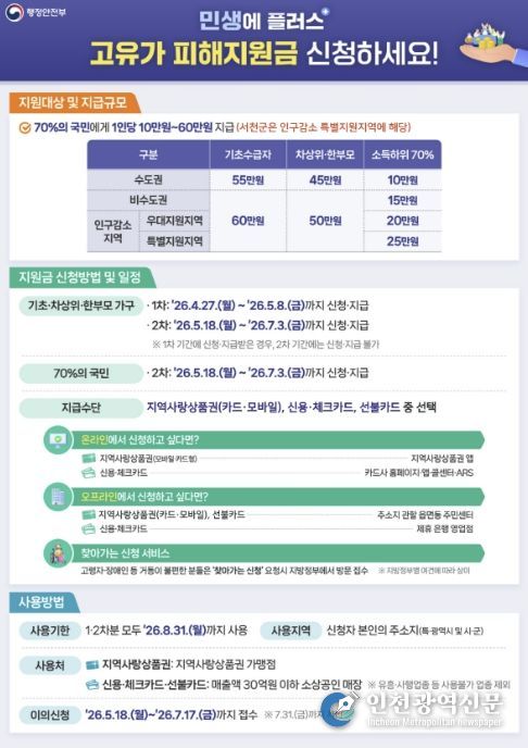 [인천광역신문] 최예준 기자 | 서천군이 중동전쟁 여파에 따른 고유가·고환율·고물가 상황으로 어려움을 겪는 군민들을 위해‘고유가 피해지원금’지급을 위한 본격적인 실행 단계에 돌입했다.