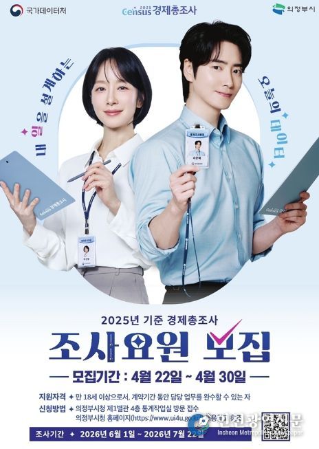 [인천광역신문] 최예준 기자 | 의정부시는 6월 1일부터 실시되는 ‘2025년 기준 경제총조사’의 원활한 추진을 위해 조사요원 77명을 모집한다.