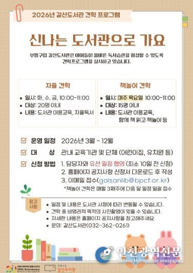 [인천광역신문] 최예준 기자 | 부평구립 갈산도서관은 지역 내 교육기관을 대상으로 운영 중인 견학 프로그램 ‘신나는 도서관으로 가요’를 오는 5월부터 확대 운영한다.
