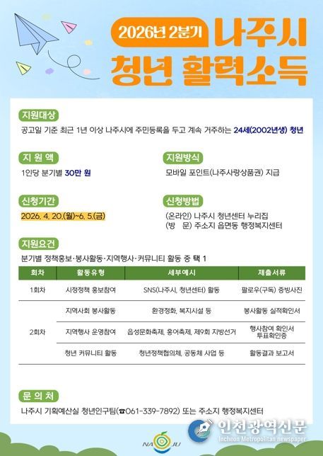 [인천광역신문] 최예준 기자 | 전남 나주시가 지역 청년의 사회참여 확대와 안정적 정착을 지원하기 위해 공공활동 참여를 조건으로 분기별 30만 원을 지급하는 ‘청년 활력소득 지원사업’ 2분기 참여자 모집에 나선다.