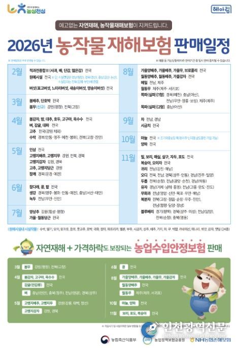 시 관계자는 “최근 태풍, 가뭄, 폭설 등 자연재해로 인한 농작물 피해가 반복되고 있는 만큼 안정적인 영농활동을 위해 농작물재해보험 가입이 중요하다”라며 “대상 농가에서는 기한 내 반드시 신청해 달라”라고 당부했다.