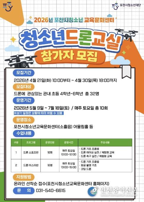 [인천광역신문] 최예준 기자 | (재)포천시청소년재단 포천시청소년교육문화센터는 오는 4월 21일부터 30일까지 관내 초등학교 4학년부터 6학년을 대상으로 청소년드론교실 1기 참가자를 선착순으로 모집한다고 밝혔다.