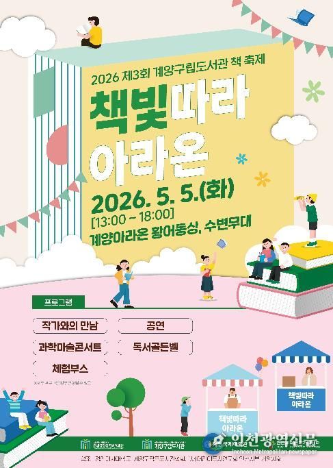 [인천광역신문] 최예준 기자 | (재)인천광역시계양구인재양성장학교육재단 계양구립도서관은 어린이날인 5월 5일 오후 1시부터 6시까지 계양아라온 황어동상 및 수변무대 일원에서 ‘제3회 계양구립도서관 책 축제 '책빛따라 아라온'’을 개최한다고 밝혔다.