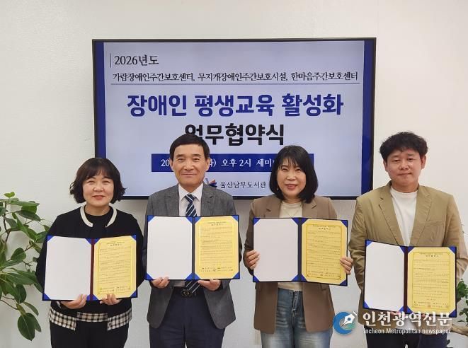 [인천광역신문] 최예준 기자 | 울산 남부도서관은 21일 도서관 세미나실에서 가람장애인주간보호센터, 무지개장애인주간보호시설, 한마음주간보호센터와 장애인 평생학습 활성화 업무협약을 체결했다.