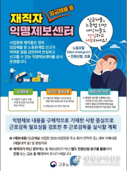 [인천광역신문] 최예준 기자 | 고용노동부는 ‘숨어있는 체불’을 선제적으로 청산하고 포괄임금 오남용으로 인한 “공짜 노동”을 근절하기 위해 「재직자 익명제보 사업장 근로감독」을 4월 22일부터 약 2개월간 진행한다고 밝혔다.