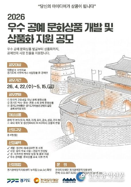 [인천광역신문] 최예준 기자 | 한국도자재단이 ‘2026 공예 문화상품 개발 및 상품화 지원 사업’을 본격 추진한다고 22일 밝혔다.